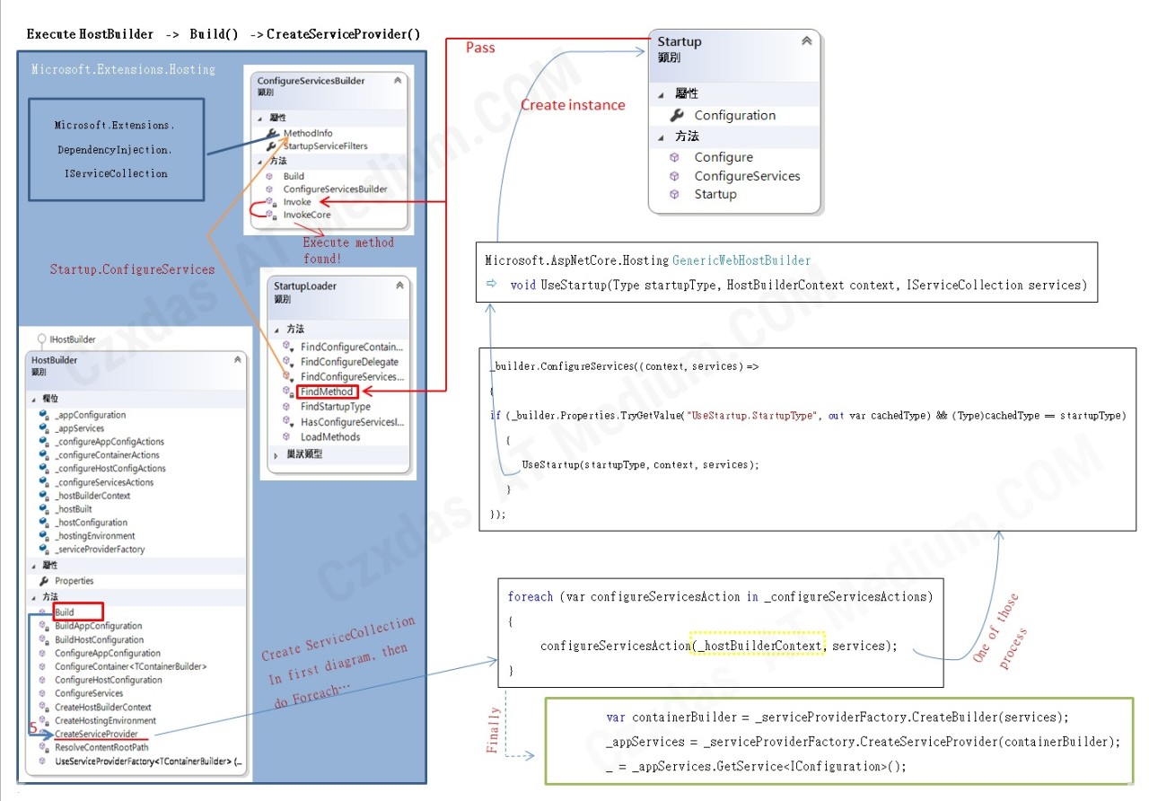 接下來是前面 "運作概述圖解" 中有提到的CreateServiceProvider部分。HostBuilder 在執行 Build 此一動作中,第5個步驟 CreateServiceProvider ,處理 _configureServiceActions中的委派事件集合,其中一個是將Startup類別實體新增,然後跑它的ConfigureServices方法。這個方法提供開法者有機會指定相關的IOC準備,儲存這些DI設定到 ServiceCollection 中。 之後在把註冊好的DI設定,利用 HostBuilder._serviceProviderFactory將包含ServiceCollection 資訊的 Provider 新增起來,並指派到 HostBuilder._appServices。