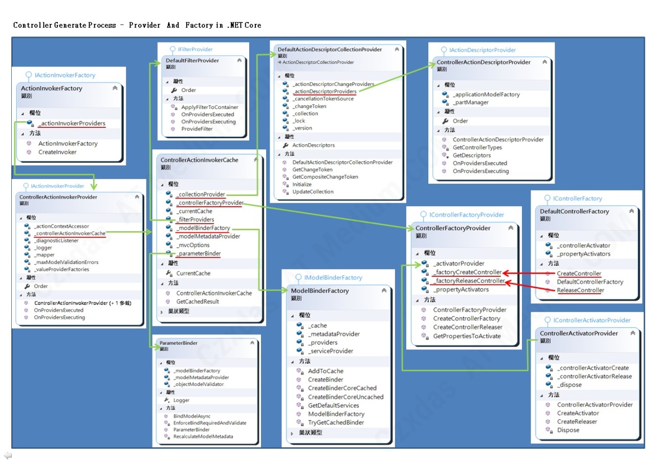 最後這個可以生成Controller實體的controllerFactory最後被指派到ControllerActionInvokerCacheEntry.ControllerFactory。而如何執行此ControllerFactory可以參考 "Resolve Controller class process"。
