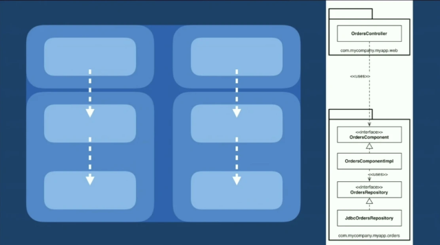 當專案中有多個功能時,這些功能會以多條垂直依賴方向進行規劃,並依據分層進行模組化打包。然而,雖然這種設計方法在功能定位與程式碼管理上具有優勢,但也可能帶來一些潛在問題。例如,開發者可能因為過於依賴既有模式,導致貨物崇拜程式設計(Cargo cult programming)的習慣出現。此外,當功能間存在互相依賴時,容易產生程式碼異味(Code Smell),進而影響系統的可維護性與可擴展性。