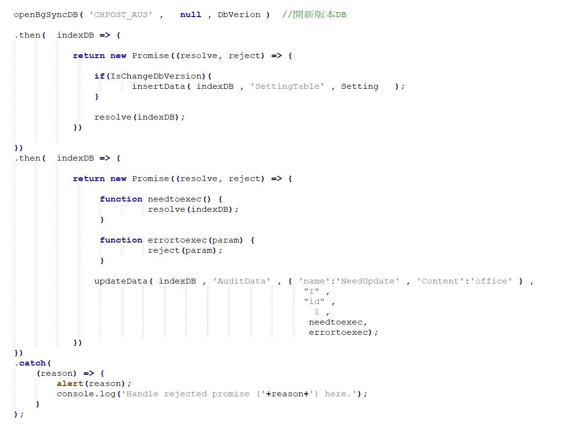 當資料庫準備妥當後,順著promise的then API接下來即為插入資料、更新資料,而最後的 catch API 則是攔截錯誤與對應適當的處理。