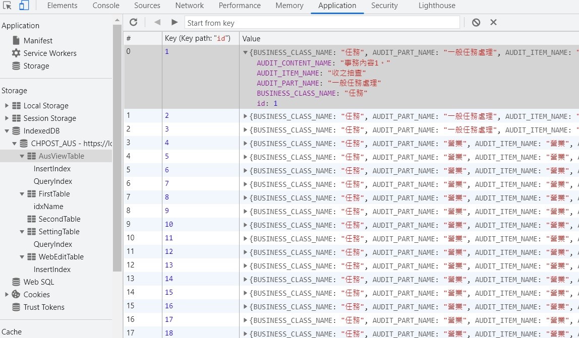 可以透過開發工具,點選Application頁籤,於左方點選 IndexDB,可以看到程式所建立的資料表,以此例在點選資料表 AusViewTable,於右方可見到此資料表內的資料。每筆資料有自己的Key,資料儲存方式是JSON。