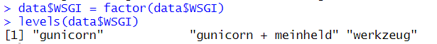 一樣用: data$欄位名稱 = factor(data$欄位名稱)