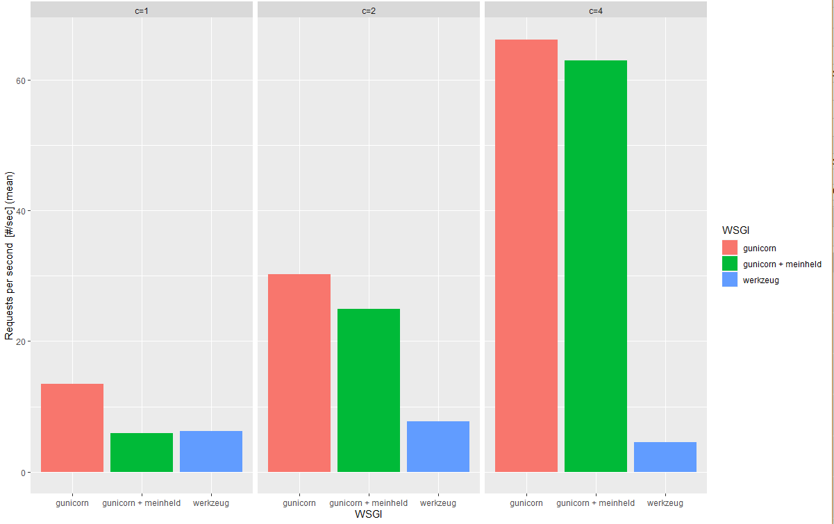 如上圖,是我們的分析結果,一張圖可以看出在c = 1,2,4下,三種WSGI每秒鐘可以請求的數量,不用畫三張二維圖來觀察在不同c下x對y的差異
