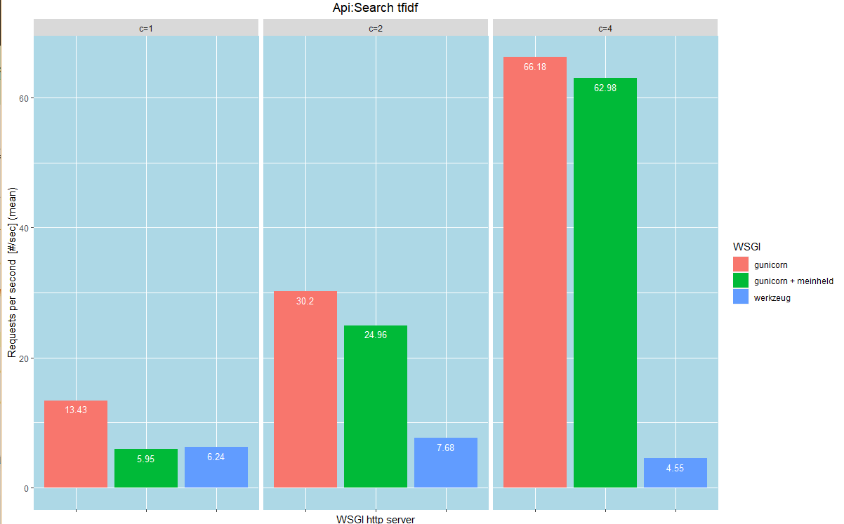 當c= 4時,一次送出4個Api請求,werkzueg每秒鐘可以處理的請求數量不變,而gunicorn可以處理66個!