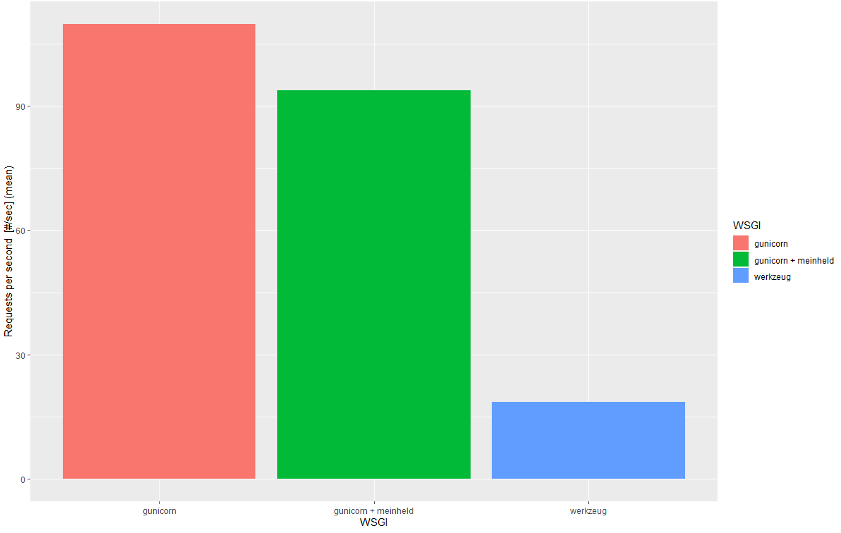 ggplot(data =df, aes(x= WSGI, y = `Requests per second [#/sec] (mean)` , fill = WSGI)) +
