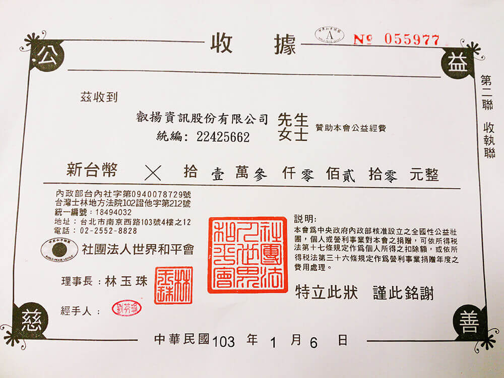 【善心捐款】世界和平X叡揚資訊,共募得一萬多元!!! 這些都是同事愛心累積起來的,也是叡揚第三年參與,希望可以幫助弱勢兒童有個香噴噴的年夜圍爐。