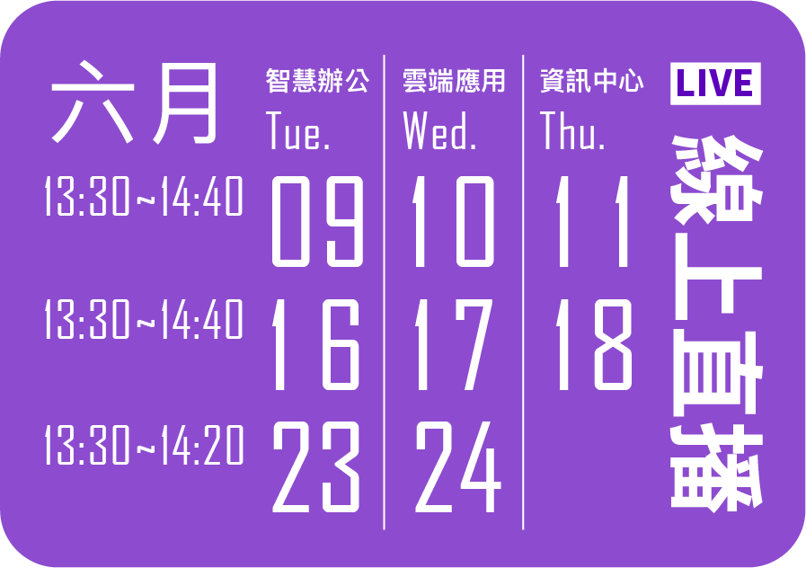 同時跟資策會合作,讓這些內容可以變成數位內容再利用,創造更多效益,這次一系列活動議題與時程如下,期待您的線上相會並誠摯期待您對於我們這新嘗試的建議: