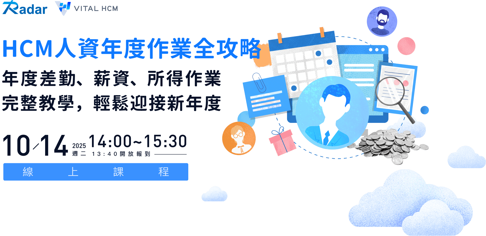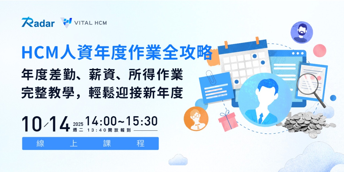 為協助您快速上手關鍵年度作業,叡揚特別安排 Andy 講師,透過線上課程為您系統化複習 HCM 中的各項年度作業設定與操作流程,協助人資高效完成年終任務,無痛切換到新年度!