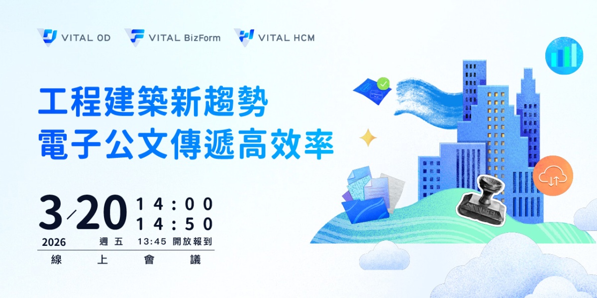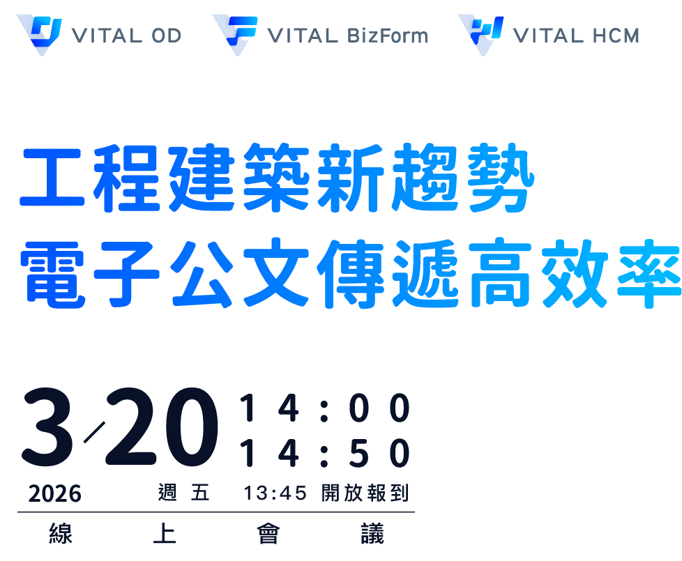 現在就報名參加,了解 Vital OD 在眾多公文系統中的差異優勢,以及如何透過公文、表單與人資管理,打造工程業與建築事務所的數位地基。