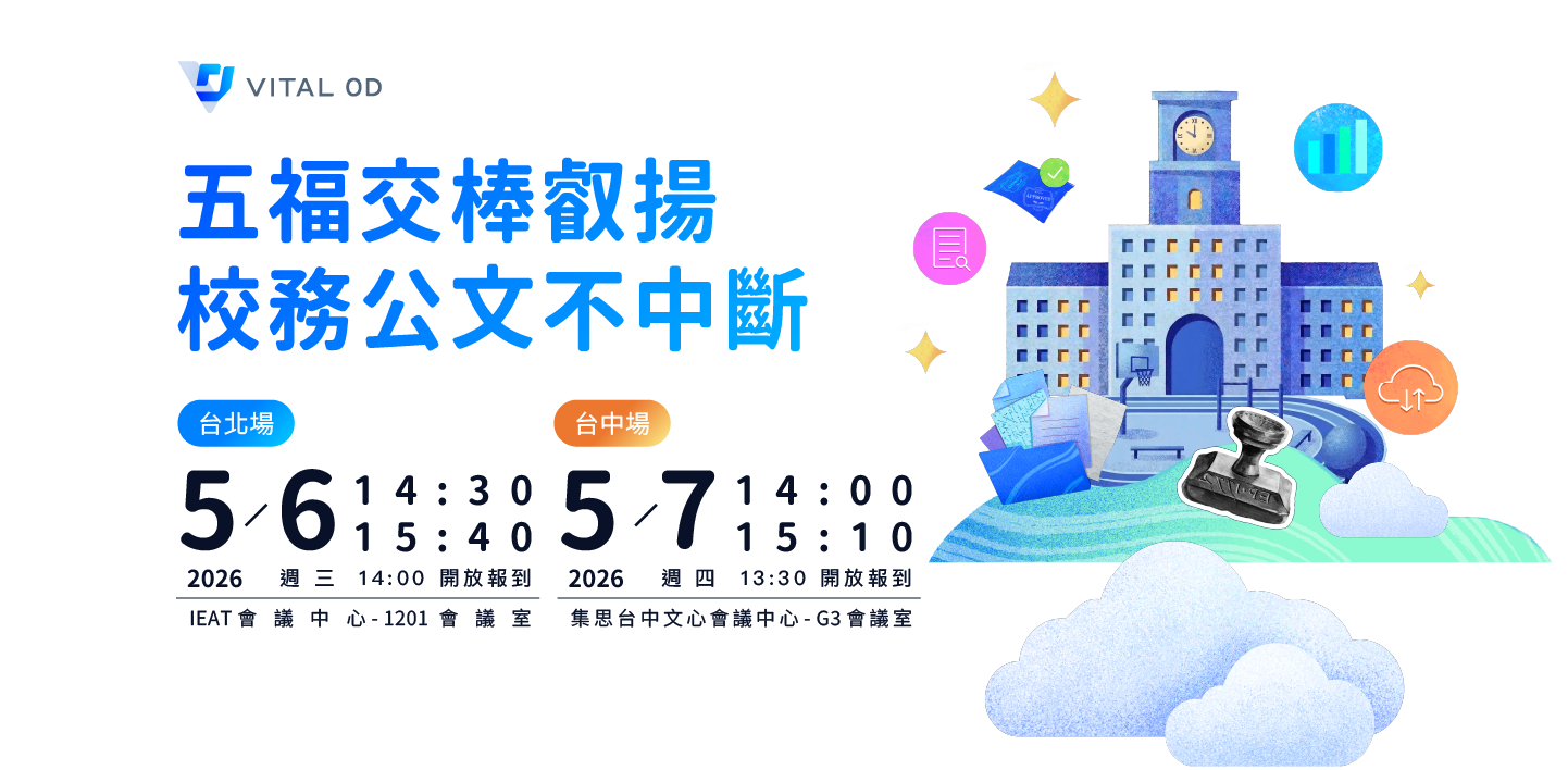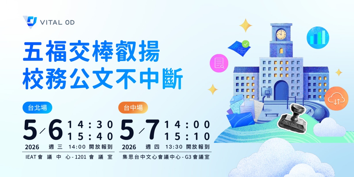 叡揚資訊長期深耕政府與教育機構的電子公文市場,也將同場介紹 Vital OD 電子公文系統的功能架構與銜接方案,供各校參考評估。誠摯邀請各校行政主管與資訊人員共襄盛舉。