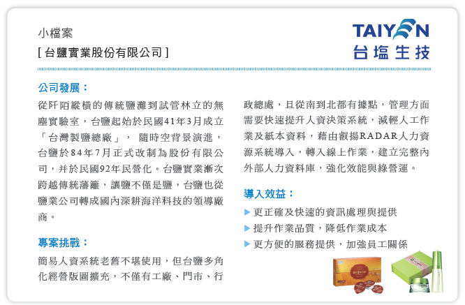 「民國88年之前,台鹽90%的營收都是鹽!」台鹽實業股份有限公司行政處處長戴瑞衡表示,短短十年間,台鹽多角化經營,跨足鹽、水、保養、保健、清潔用品以及鹽雕六大類產品,相較於以往專注於鹽品生產販售,整體組織變得多元且複雜,再加上民營化後的人力精簡,更凸顯人事系統老舊問題,「藉由導入叡揚RADAR力資源系統打通e化脈絡,去掉繁雜的人工紙本,提升效能新契機。」戴處長強調,紮好人資系統基礎馬步後,中長期將往目標管理及績效考核邁進。