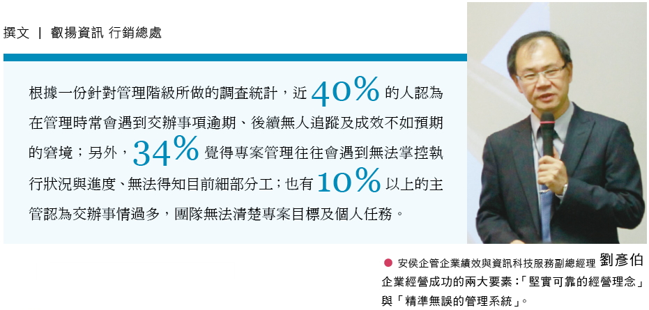 劉彥伯也特地舉例說明,工作流程往往會在有 形無形當中出現癥結點,拿有形的產線來說, 「KPMG 在輔導許多企業的案例當中,往往會發 現經理變科長、科長變成產線,這些管理階層花 太多時間處理異常或是突發狀況,反而忽略最重 要的整體流程推動及工作指導。」他也強調,從 無形面來看,組織內部大多還是以Excel 管理和 以 E-mail 來溝通,但其實,這種管理方式比較 適合微小型企業,「隨著組織日益龐大,Excel 來來往往修修改改會有 亂難以整理的瓶頸,加 上E-mail 資料散亂無法串連、又容易被修改, 過程資訊不能整合在一個地方,且要由個人保存 與管理,反而更容易出狀況,如漏看等,這對協 同作業是一大致命傷。」
