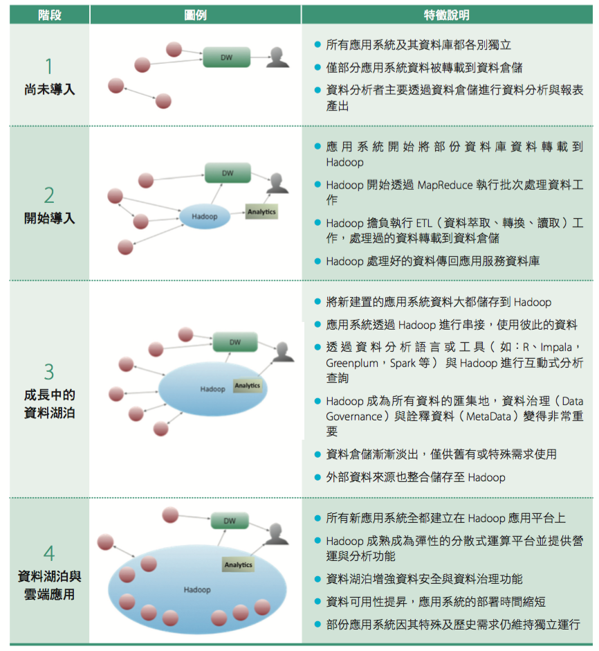 目前大部分企業仍處於尚未導入時期;有些開始導入Hadoop 的企業則處於剛導入階段;僅少數公司如Google 及Facebook 等因其資料規模大到需要高效率的資料處理架構而發展至最後極致階段。不論現在每個企業身處哪個階段,展望未來,資料湖泊的概念將持續引導企業建構滿足面對巨量資料挑戰的資料處理架構。