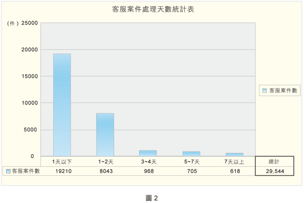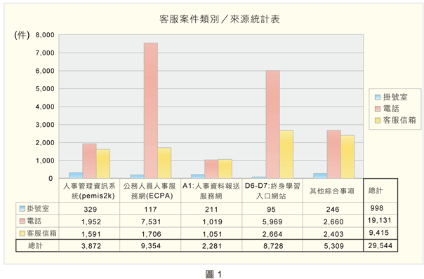 - 客服案件數量分析:下圖為PICS最大宗客服案件數的問題分類分析圖,客服案件來源主要是客服專線電話、客服信箱及線上掛號室。自99年1月至4月底合計有29,544件客服案件,平均每月有7,386件客服案件,人事行政局現有7位一線客服人員,平均每人每月有1,055件的客服案件服務。客服案件類別/來源統計表(圖1)及客服案件處理天數統計表(圖2)如下。