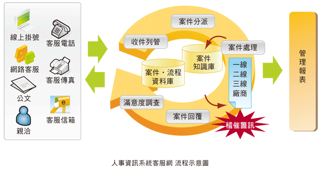 - 整合客服自動化系統,客服案件全程管制稽催:人事行政局資訊室受理的人事資訊系統服務案件每月平均達7千件以上,並隨著系統擴增案量持續增加。以往是採用傳統的電話交換設備、傳真、電子郵件、線上掛號等管道,案件需由客服人員手動登錄,且對於電話來量、通話長度、等待時間及客服人員工作量無法提供客觀數據。有鑑於此,為有效管理人事資訊諮詢案件服務品質,人事行政局於98年建置人事資訊客服自動化系統,透過自動化設備整合各種諮詢管道,以有效改善案件的登錄並提供完整服務資訊。PICS上線後整合客服自動化系統,將客服諮詢案件收件後,從1線客服人員、2線技術人員、3線系統負責人及4線廠商,全程納入管制稽催,以縮短案件服務期程,有效控管服務案件,提高服務滿意度。