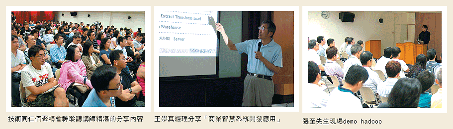 「雲端運算」是由微軟開發工具暨平台推廣處劉念臻博士與周旺暾經理從微軟的角度談雲端運算的發展與未來期待,現場特別示範了透過Visual Studio .NET 2008來建立Windows Azure程式並佈署到Azure上,並更進一步說明微軟對雲端運算市場的期待與未來收費方式,還有目前Windows Azure的建設狀態;第二場由國立清華大學資訊工程學系的張俊盛教授與元智大學的張至先生,介紹在學術界裡面的雲端運算用法,張教授在自然語言領域鑽研多年,這次介紹了雲端運算與其對研究上的幫助,並透過hadoop做分散式運算,分享張教授團隊在實驗室所架設的小cloud來展現其優異運算與堆疊能力,讓大家實質上都增廣了許多知識,更激盪出不同的雲端思維,收穫良多。