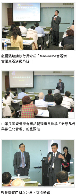 叡揚張培鏞執行長也於研討會中介紹叡揚最新研發的「teamKube會辦活--會議交辦活動系統」,利用創新的會議活動管理機制,大至跨校各項活動會議,小至校內或系內教授與學生的約會管理皆可透過系統進行追蹤管理以帶動校務行政的革新與便利。