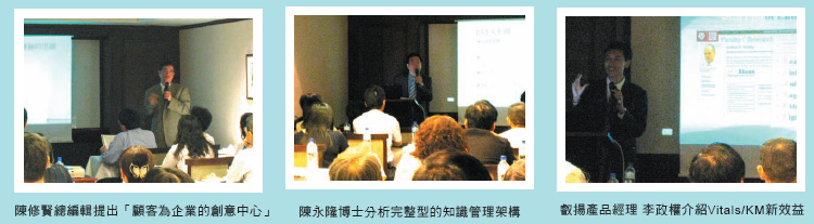 陳永隆博士以策略、組織、科技、流程、內容、文化、創新七大面向來解說完整型的知識管理架構,並在會前訪談叡揚的台中榮民總醫院、雷爵網路科技(股)公司、台灣NEC(股)公司三客戶,整理出在推動Vitals/KM知識管理系統時所必須要規劃執行的內容及方向,更進一步說明企業如何有效運用知識管理系統,大幅節省人力資源,更幫助企業在龐大的資料系統下有效率的運用內部資源,共享知識經濟,進而提升公司效率及競爭力。