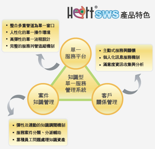 Heart-SWS是一套建構於知識管理平台之上的服務管理系統,無論是一線的客服人員或是二線的業務權責人員,皆能夠藉由系統主動告知的相關服務知識,即時提供客戶專業且正確的服務資訊。即使是新進的服務人員,也能夠像資深的人員一樣將棘手的問題處理妥善。
