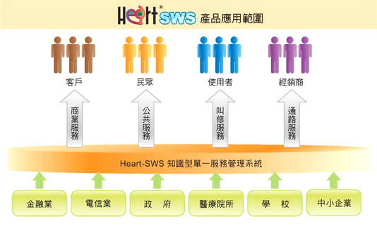 Heart-SWS知識型單一服務管理系統是叡揚資訊CRM(顧客關係管理)產品系列之一,產品應用範圍廣大,無論是金融業、電信業、製造業、醫療院所對客戶提供的商業服務,或是政府機關對民眾的公共服務、學校對學生及家長的教育服務,甚至是各產業IT部門對內部員工的需求管理、叫修服務等,皆可利用此服務管理平台統一管理。