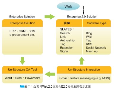 企業內IT(資訊科技)與IS(資訊系統)歷經幾十年的不斷演化,由結構化之數字型應用到非結構化之OA文件處理應用,到Interaction與Real Time之Mail與InstantMessage之應用,以至於最近的E2.0之協同聚眾、關聯、主動等之應用可以說是一種自然演化,我們以上列簡圖做一綜覽,從E2.0SLATES所描述的精神與所需技術可以了解這演化都是為了解決目前最重要競爭力導引下的Knowledge Worker生產力與日益蓬勃的全球化協同運作需求,也無怪乎KnoledgeManagement這概念與相關市場最近幾年被高度重視且愈形重要,最近有一報導指出在各界過去幾十年努力尋求處理數字的資訊技術與應用後,這領域已趨成熟,目前重心已轉至努力解決知識工作者生產力所需的知識管理工具,這可以由美國在2007年的市場達到730億美金可以略窺一二,這知識管理所談的功能大致上也就是E2.0所指出的SLATES 精神與技術。