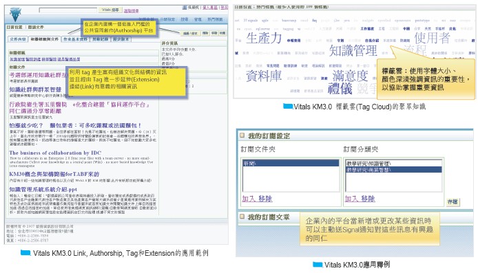 叡揚資訊於2005年初即開始開發的Vitals/KM,當時雖尚未有Enterprise 2.0與SLATES的概念,但我們很高興發現我們產品的創意與設計卻與這些概念極為接近,最近推出的新版Vitals/KM3.0新版又加上Tag功能,以及我們於去年啟動並將於今年底完成的整合Wiki與Vitals/KM計畫將讓我們具備最完整與前瞻的Knowledge Worker使用平台,目前我們的投入已經由市場接受度、用戶的好評與市場佔有率得到鼓舞,同時也看到客戶逐步聚集內部廣大同仁的多元意見與智慧貢獻正在形成,這也是對於我們戮力開發此產品同仁的最大鼓勵。