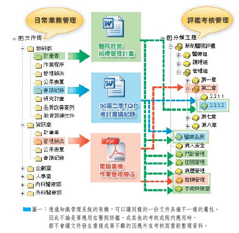 有參與過醫院評鑑的人都知道,在做醫院內部預評時,只要發現其他單位負責的卷夾資料也是自己負責項目可以利用的資料時,就會開始以「複印」的方式來「分享」這份資訊,另外,如果醫院所使用的電子資料管理系統不具多維度特性時(就是讓文件只有唯一的一份,但是可以賦予多種屬性),一樣也會面臨到文件分散複製的狀況,進而造成版本控管的麻煩。這即便是有了電腦系統,在管理面仍然沒有解決文件管理的根本問題!