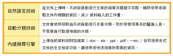 知識管理系統除了要能夠符合管理的需求進行彈性的設定外,最重要的是它結合了許多重要的輔助功能,例如:自然語言技術、自動分類技術、內建搜尋引擎等,這些都能讓使用者用最簡單、便捷的方式操作,即便是沒有太多電腦操作經驗的第一線醫護人員,都可在最簡單的訓練下正確的操作系統,並且達到單一文件、多重分類的管理需求。有關上述三項技術的功能說明如下表: