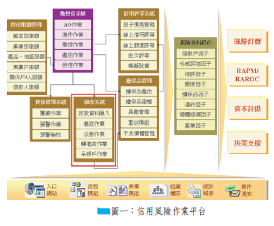 當前銀行所面臨的衝擊,各項風險類型占有極大比例,其中有流動性風險、利匯率風險、信用風險、資本風險、作業風險、市場風險、法律風險等等,雖然中外學者看法各有不同,但大致都認同信用風險為銀行最重要的風險管理項目,據金管會銀行局統計的銀行各項風險比重,信用風險就佔了60%,因此,信用風險的品質良窳,對銀行影響至為重要;在新巴塞爾資本協定中更將第一支柱最低資本需求,依信用風險、作業風險及市場風險三種風險種類,規範不同的方法計算最低資本需求。若以資訊系統支援的角度而言,銀行的信用風險管理資訊平台(如圖一)必需要能提供充足的資訊,以協助董事會與各管理階層執行各別風險的監控,並能支援銀行在新巴塞爾資本協定所選定的資本計提方法,及掌握授信組合資訊。