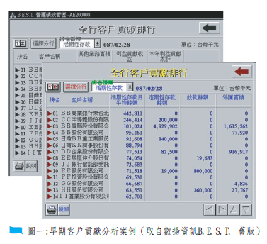 金融單位針對所提供的各項產品(如定期/活期存款、放款餘額、承兌與保證或外匯)的額度與利益貢獻來劃分其分類,並以趨勢分析來估算客戶未來可能的貢獻(參考圖一所示)。這樣的方式很明顯的忽略了風險因子的考量。這在90年代後期因為金融商品的多樣化,再加上跨國金融服務模式的興起,所需面對的風險從外在的「市場風險」到交易對象違約、倒閉的「信用風險」,銀行內部的「作業風險」,甚至於各項產品組合間的相關性風險也都須加以考量,因此,在估算的效益時的成本即會從傳統會計成本,進而轉化為風險成本。