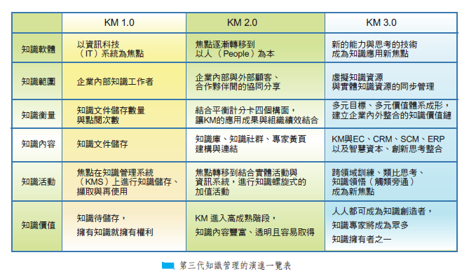 作者將知識管理發展歷程分成三階段,分別以KM 1.0到KM 3.0代表第一代至第三代的知識管理。