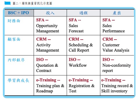 當BSC + IPO構成一個完整的績效衡量模型之後,接下來管理者可能會關心的是,這些衡量指標散在各處,資料如何取得?如何彙整?許多立意甚佳的衡量指標,如果無法經由資訊化自動產生和彙整,單憑人工收集,是很難持續的。所幸在這衡量模型中,對應系統的資訊化程度已相當高,以服務業為例,典型的「財務構面」衡量指標,可來自銷售自動化系統(SFA ?Sales Force Automation,為CRM的一環)。其中商機管理(Opportunity Management)可用來衡量銷售的「投入」;銷售預測模組(Sales Forecast)著重在達成業績「過程」的衡量;而銷售績效分析(Sales Performance)則是典型的銷售「產出」衡量。另外在「顧客構面」,典型的CRM系統包括工時管理(Activity Management)模組,可用來衡量業務、服務人員對客戶的「投入」;行程管理(Scheduling)及拜訪記錄(Call Report)可用來衡量業務推廣及服務的「過程」;而客戶價值、貢獻度分析模型(Customer Value Analysis),則可衡量客戶經營的成果,包括客戶留續率和新增率等「產出」。
