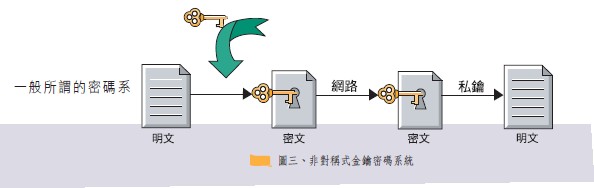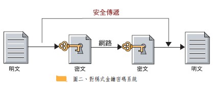 一般所謂的密碼系統,其主要功能在於提供一加、解密以及認證機制,使得使用者可以先將敏感性高的資料進行加密後再進行傳遞或儲存的動作,等到要再次使用該筆資料時,使用者須先經過一認證與解密的過程方可還原資料,而後進行使用。目前密碼系統主要可分為對稱式金鑰密碼系統以及非對稱式金鑰密碼系統兩種。所謂對稱式金鑰密 碼系統其所使用的加密金鑰與解密金鑰是相同的(上圖二),其優點是加、解密的速度較快,缺點是需有安全通道將金鑰傳遞給解密者,目前常見的對稱式密碼系統有DES、3-DES、RC4、IDEA...等。