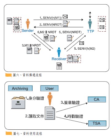 一般電子文件在傳遞過程中,送收雙方透過一些公開標準協定,在網路上進行通訊,其缺點已於前述章節中介紹。本節我們參考ISO13888-2所定義的標準模式發展出應用於電 子文件在傳遞過程中可能運作模式。首先送方先將文件M1好,然後對M1做數位簽章,並將M1的Hash值,h(M1)送至公正第三者(TTP)做存證服務。TTP做完存證服務後即產 生一存證收據,送方在收到存證收據後,再將文件M1與存證收據一併送到收方。收方在收到M1與存證收據後,讀取M1並計算其Hash值,h(M1),再從存證收據中取得h(M1)然後比較兩者是否相同以確定文件的正確性並檢驗時間是否正確?若以上兩者皆正確表示文件M1內容與存證無誤。至此整個傳送作業即可完成。接收端如果有資料要回傳,亦可依照上述作法執行,如圖六所示。