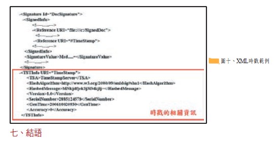 檔案及文件管理之電腦化作業必須建立在共通規範之基礎上,以利機器與人類辨識。有了明確共通規範,各界即能應用或開發符合共通規範之公文電腦化作業系統。目前國際標準、國家標準或業界標準皆以XML作為定義之工具。然而在開放式的網路環境中,使用XML文件做直接資訊的傳遞是不安全的。本節我們將利用XML文件來具體說明如何將PKI應用至線上簽核系統。在數位簽章部分,W3C已有XML數位簽章標準可依循,但在時戳部分則尚無標準可依循。圖十為我們舉例可能的實作方式,其中在紅框內為有關XML文件的時戳資訊。