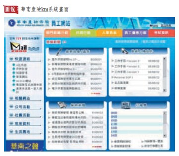 目前華南產險的知識文件上,是以各分公司、組織單位來建置,並將公司各單位的公用表單及相關業務資料上傳。其中在公司入口網站中的首頁,使用者也可以馬上看到知識管理中的「最新文件」,只要輕鬆點入就可直接連結該文章,得知各單位所公佈的最新文件資料,這個部份讓很多同事都覺得很方便。同時,Vitals/KM知識管理系統對公司同仁而言更是有莫大助益,像是行銷或企劃人員,在製作一些報告或DM時,經常利用知識管理上的文件,找尋相關資料;另外,業務上所需的專業知識,例如核保準則進階訓練...等資料,都可以讓新人透過公司的知識管理系統先行查閱,節省新人訓練的時間。