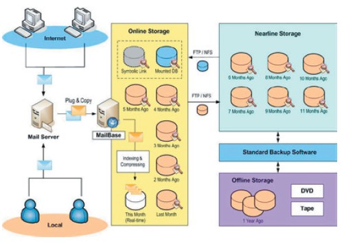 由於MailBase伺服器本身的硬碟空間有限、成本相對較高,另外,基於信件資料的安全性考量,建議將所有的郵件資料庫除了備份在MailBase主機硬碟當中(即Online Storage),另外,再備份到Nearline與Offline的Storage,以三個階段進行交叉備份(如圖一所示)。這三者的差別如下: