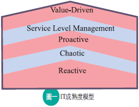 據全球知名的Gartner Group分析報告中指出,組織的IT成熟度可依「IT成熟度模型」(IT Maturity Model)(如圖一所示)分為下列五個層級: