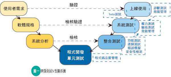試就僅以軟體開發過程中所需的測試工作舉例,就包括單元測試、整合測試、功能測試、迴歸測試、壓力測試、效能測試、系統測試、驗收測試、有效性測試、正規分析等等;在圖 1的「開發測試V型關係圖」中,簡單明瞭的呈現出在各不同的開發階段和幾個主要的測試項目之間的對應關係。