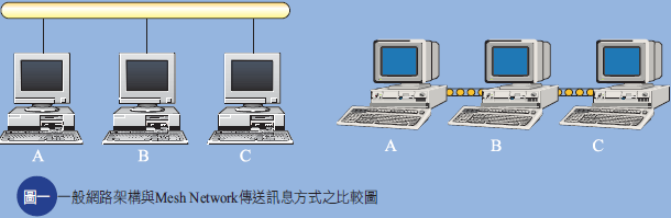 在解釋Wireless Mesh Network之前,要先解釋什麼是Mesh Network(網狀網路)。Mesh Network其實並不是最近才發明的新技術,很早以前就有人提出了。它源自於美國軍方無線網路架構的解決方案,具有嚴格加解密的通訊調變能力,以及後端資料的安全管理。Mesh Network具有與傳統有線網路截然不同的特性,包括隨時可能改變的網路型態、沒有方向或範圍限制的移動等,因此,它需要一種新的路由協定(Routing Protocol)來替這些Node(節點)找出彼此聯繫的路徑,這是一種完全無線、可任意移動的網路架構,不需基地台,所有Node可以任意地進行連結,且每個Node同時具有Router(路由器)的功能。試想一個不用Hub網路架構的環境,當A電腦要傳訊息給C電腦時,目前傳統的作法是必須先連到一個Hub,藉由Hub用Broadcast的方式傳送訊息。但是Mesh Network則是採用A→B→C的方式,藉由B電腦扮演中介者角色來達到傳輸訊息的目的。(如圖一所示)這種觀念在日後也被拿來當作P2P搜尋檔案的方式,如目前當紅的eMule中Kademlia Network 正是利用這種概念作檔案的搜尋。