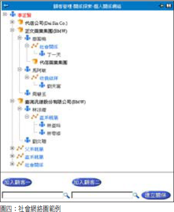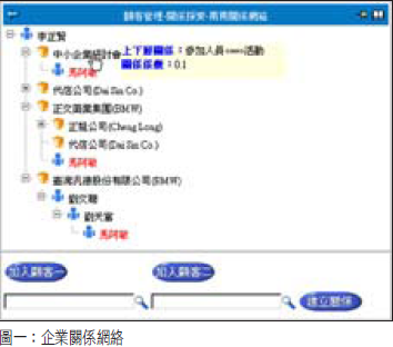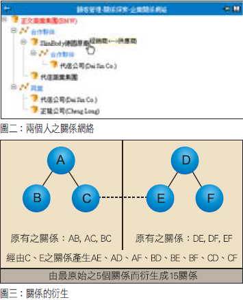 在了解前述社會網絡之重要性後,接下來,我們可嘗試好好的來整理所認識的企業及朋友的資料及其社會關係網絡。如果是剛步入社會工作的社會青年,或許只需妥善索引卡及名片來管理其人脈資料庫;但隨著社會歷練的涉入程度日深,所擁有的人脈資源亦會跟著變的龐大且關係複雜,而形成一大片關係縝密的社會網絡,此時,光靠索引卡及名片是無法協助您做好人際關係管理。此時,您可利用電腦軟體,如客戶關係管理系統,從旁協助您做好累積不易的人際關係資產管理,如此一來,只需輕鬆地利用系統的輔助,即可協助您輕鬆記憶企業體、個人的基本資料、歷史、重要關係人及其他重要資訊;更可藉由資訊系統協助處理兩兩關係連結的重要工程;可利用資訊系統立即描繪並掌握一個人的社會網絡,或者是企業的企業網(如圖一所示)。透過系統的協助,某個企業的關係網絡立即呈現、所有關係一目瞭然,同時可藉由這些資訊,企業可以發展出較正確、有利於企業的競合策略,達到業務目標。另外,透過系統的輔助,可輕鬆找到個人與客戶、或客戶與客戶間的兩兩關係(如圖二所示),如此一來,組織成員就能夠利用資訊找到能求人求事的貴人。