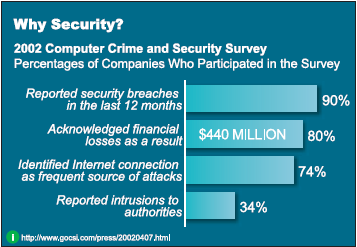 根據一份2002年美國FBI舊金山總部與電腦安全協會針對二百多家企業進行的一份調查報告顯示,其中高達九成的企業認為,應用系統曾遭到駭客的侵入與破壞,而其中更有八成的企業表示,由於應用程式缺乏嚴謹的安全防護致使安全漏洞大開,直接衝擊並造成實質的財務損失,估計損失大約將近4億4仟5百萬美元,也就是說,平均每家企業因應用程式安全的失防問題所造成的損失就超過兩百萬美元(如圖一所示),這也凸顯出如何開發一套具有安全考量的應用程式,已是未來的程式開發的首要任務。