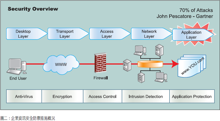 通常企業較著重系統層與網路層的資訊安全防護措施,於使用者桌上型電腦內會安裝防毒軟體以防止電腦遭人植入後門或木馬程式,於網路層則會架設防火牆與入侵偵測系統做為防範,以保障並同時降低企業內部電腦設備被入侵的機率。然而,即使企業的資訊安全防護措施已做到滴水不漏,業界發生多起重大的資安事件仍時有所聞。據Gartner Group統計指出,將近百分之七十的駭客攻擊事件是發生在應用系統層(如圖二),而非作業系統層與網路層,其主要原因可歸類為以下幾點: