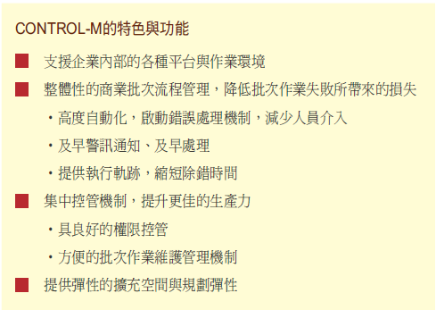 企業要成功地解決批次處理調度的問題,同時達到業務目標,就必須採用一個可靠的、靈活的批次處理解決方案,有效地管理關鍵業務流程,將整個企業的成功關鍵因素。由叡揚資訊代理BMC Software公司的『CONTROL-M批次處理管理解決方案』正是應大型銀行或金控集團之業務要求而研發的產品。CONTROL-M將企業內的IT流程與業務目標相結合,有助於從IT環境中達成真正的業務價值,達到集中控管跨系統批次處理、以及企業級批次處理管理的需求。