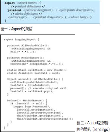 在AspectJ的範例中可以如圖一與圖二的操作,Aspect的實作我們稱為Advice,在Method呼叫或離開的地方稱為Joinpoint,而實際應用到的Method則稱為Pointcut。