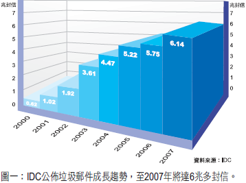 企業電子郵件飽受垃圾信影響已是眾所皆知的事實。根據IDC日前公布的「2003至2007年全球電子郵件使用預估報告」中顯示,2003年全球流竄的垃圾郵件高達3兆6億多封,預計到2007年將會成長到1.7倍,達6兆多封信。由此可見,垃圾信對企業運作效率的影響將不言可喻。