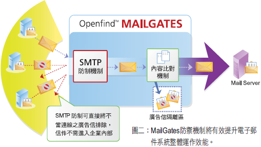 為有效遏止日益氾濫的垃圾信件問題,除採用郵件內容偵測的方式外,更應加強主動式SMTP連線阻隔能力,透過SMTP連線行為判斷,主動將垃圾信排除在大門之外,可避免大量垃圾信件湧入系統內所耗用的頻寬與軟硬體資源。根據Openfind本次調查的結果顯示,MailGates採用連線區域評價及連線行為分析等技術,在Mail2000付費信箱每天超過上百萬封的信件傳輸過程中,先行於 SMTP 連線階段有效阻擋30%至40%的不正常連線,可大幅降低系統負擔。由此可見,優良的郵件防護系統應具備多樣化的防護能力與過濾機制,才可以真正讓用戶免於垃圾郵件的困擾。