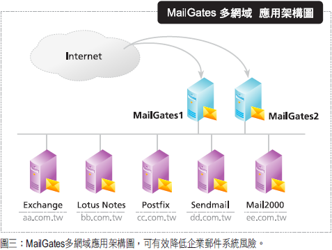 因為組織架構調整及業務上的需要,許多中大型企業例如金控公司或跨國性組織,通常擁有多個不同網域主機,並建構多台郵件伺服器來收發郵件。對於多網域、多伺服器的郵件系統而言,Openfind MailGates郵件防護系統可帶來絕佳的系統防護與成本效益。由於MailGates的優秀電子郵件收發效能,輔以多台共同運作的Load Balance架構,讓企業可以放心將原本分散在多個網域、多台郵件伺服器的流量集中在MailGates上,透過MailGates提供第一線的郵件安全防護與垃圾郵件過濾。這樣不但可以降低企業郵件系統風險,更可節省大量昂貴的頻寬與硬體成本。