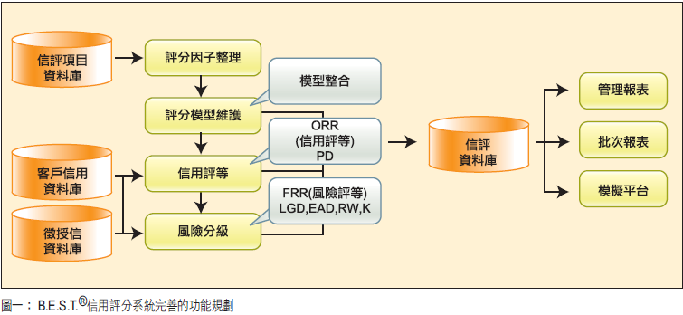如圖一所示,「B.E.S.T.®信用評分系統」主要的功能包括了評分因子與模型資料庫維護、即時評分、批次評分、