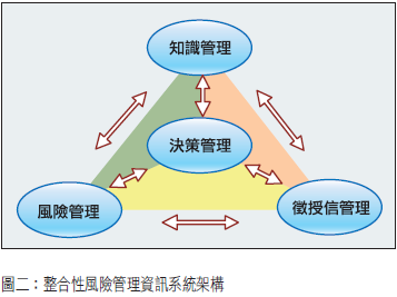 新巴塞爾資本協定的實施,除了對銀行造成壓力外,對資訊廠商而言,更是一項嚴苛的挑戰,唯有結合前瞻的規劃能力與豐富的實務建置經驗,才能與銀行業攜手向前,共創雙贏。在COSO企業風險管理整合架構(Enterprise Risk Management Integrated Framework)的大框架下,新一代完整且具整合性的風險管理核心系統將如圖二所示,包含了決策管理、風險管理、徵授信管理以及知識管理,透過決策管理進行企業願景、風險管理策略的連結制定及風險目標的設定、管理與監督,藉由風險管理進行風險事項辨識、風險評估與KRI(Key Risk Indicator)的回饋;運用徵授信管理進行實際的風險回應與控制活動;而利用知識管理則可進行內外部動靜態風險資訊的收集與溝通。導入叡揚資訊運用豐富徵授信系統建置經驗所開發的「B.E.S.T.®信用評分系統」,將可幫助銀行業打造出巴塞爾資本協定風險管理的磐石。未來,進一步結合叡揚資訊知識管理系統的相關導入實務、自然語言機制的研發能量以及EIS完整工具的整合方案,更將為銀行業打造出前瞻的資訊環境,建立以風險管理為核心的資訊新視界。